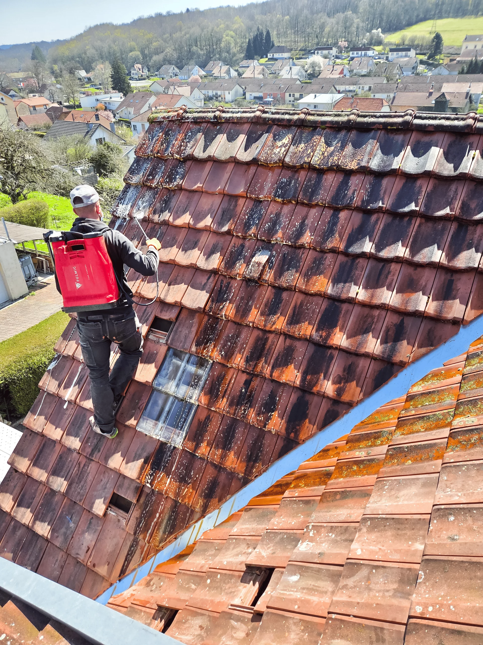 Les mousses, lichens et autres végétations sont d’abord retirés manuellement, avec précision et sans agresser les matériaux. Ensuite, un traitement spécifique est appliqué pour empêcher leur réapparition tout en respectant votre toiture. Nous réalisons aussi le nettoyage des gouttières.